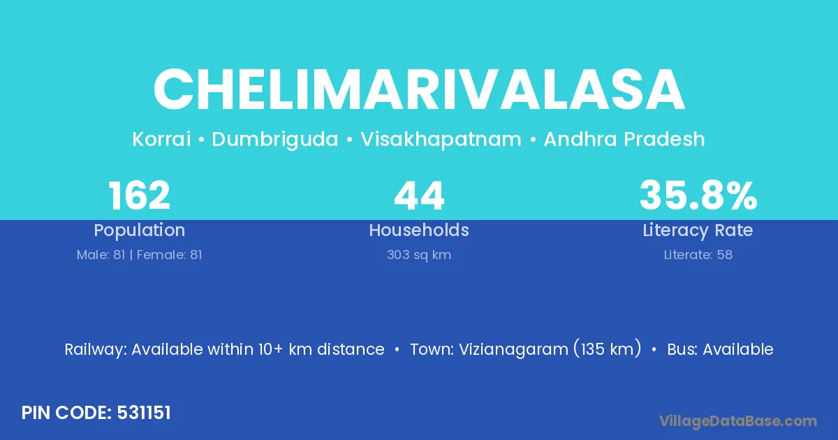 Chelimarivalasa village has a total population of 162 people, of which 81 are males and 81 are females.