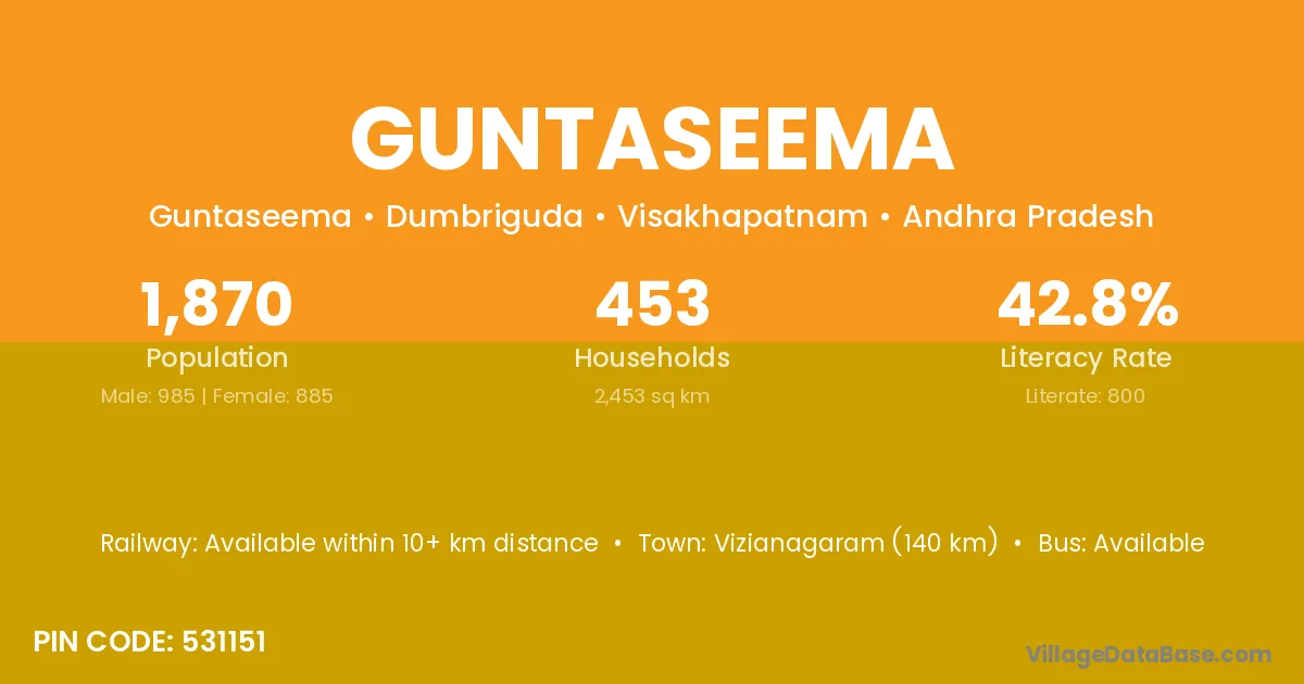 Vizianagaram (140 km) is the nearest town to Guntaseema village for major economic activities and is located approximately 140 km away.