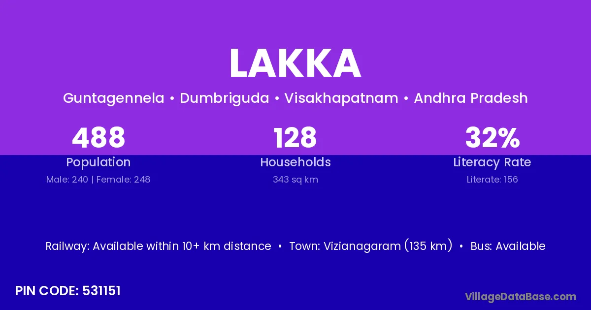 Vizianagaram (135 km) is the nearest town to Lakka village for major economic activities and is located approximately 135 km away.