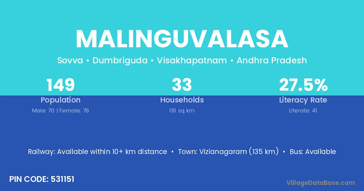 Malinguvalasa village has a total population of 149 people, of which 70 are males and 79 are females.