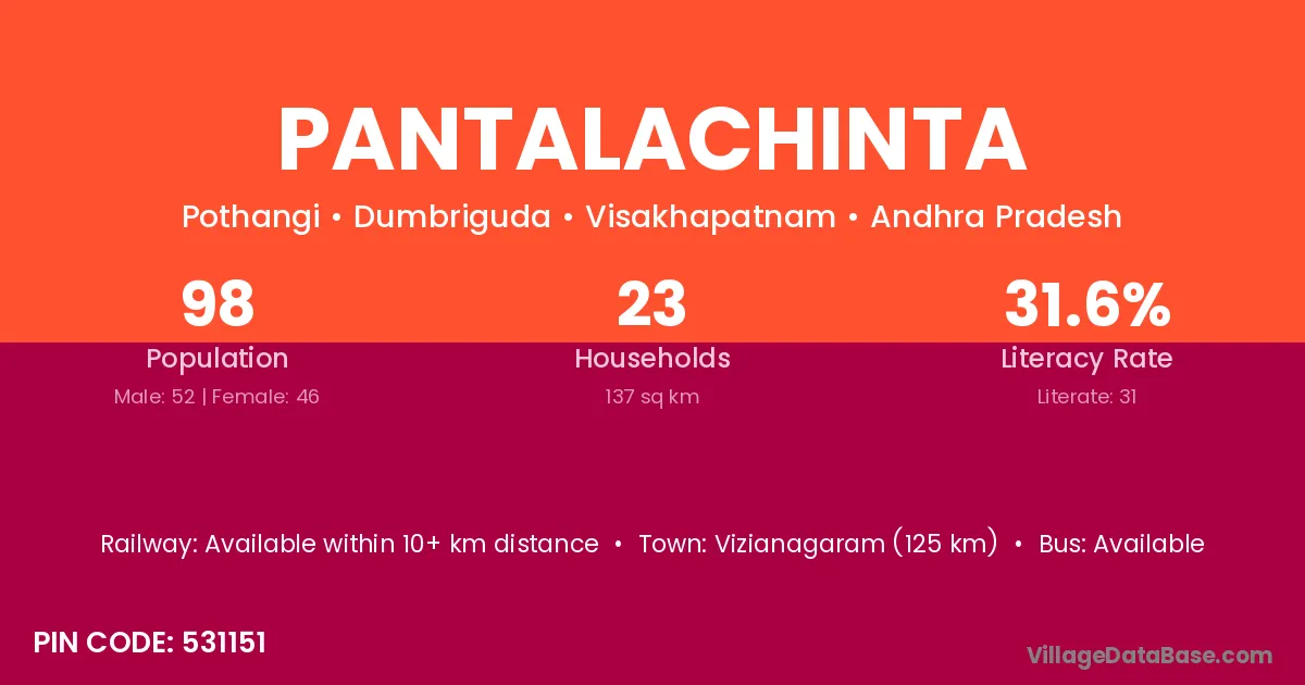 Pantalachinta village has a total population of 98 people, of which 52 are males and 46 are females.