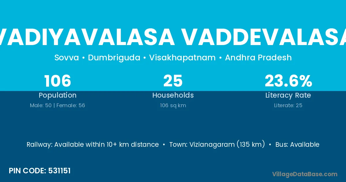 Vadiyavalasa Vaddevalasa village has a total population of 106 people, of which 50 are males and 56 are females.