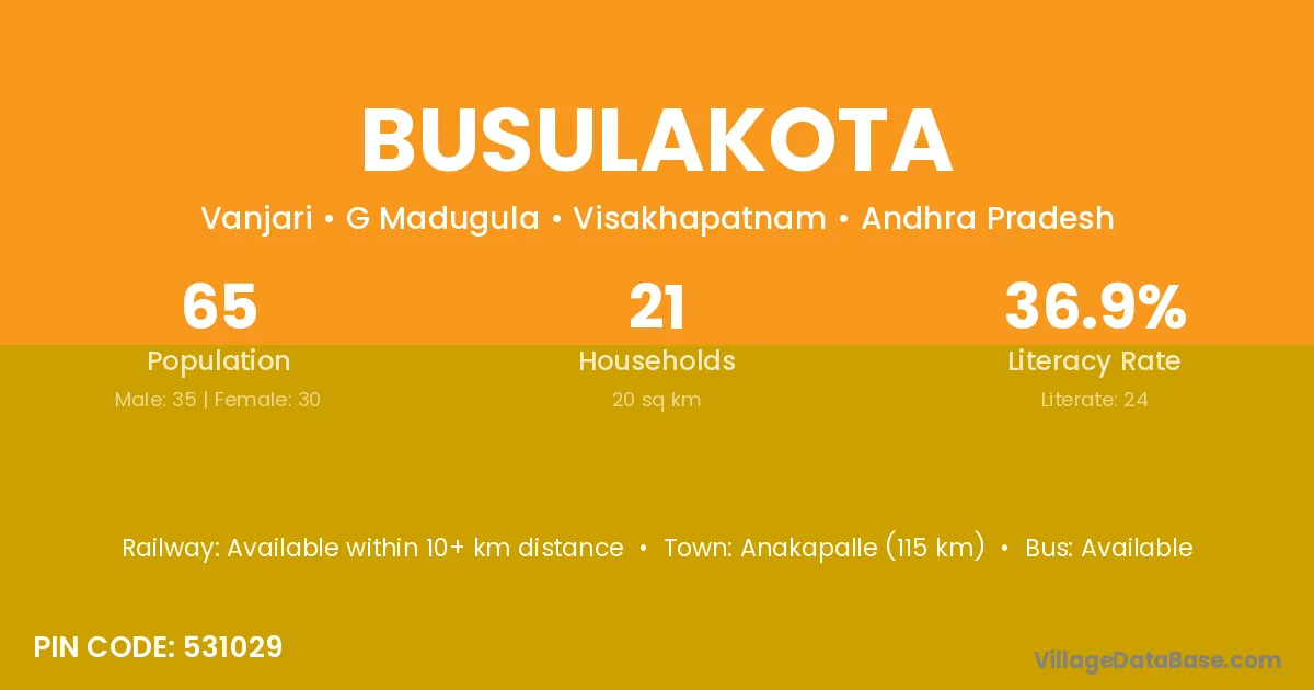 Busulakota village has a total population of 65 people, of which 35 are males and 30 are females.