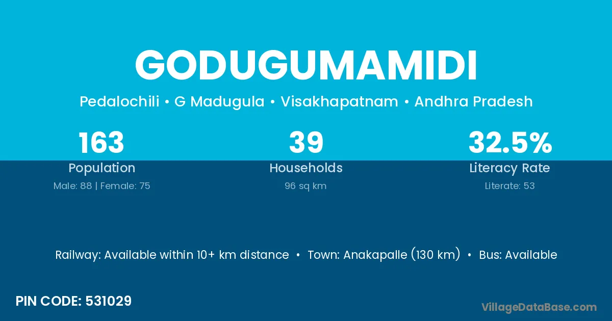 Anakapalle (130 km) is the nearest town to Godugumamidi village for major economic activities and is located approximately 130 km away.