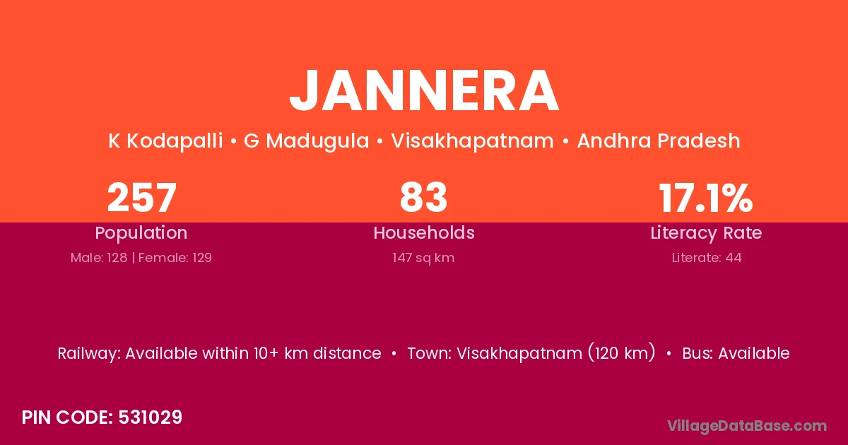 Visakhapatnam (120 km) is the nearest town to Jannera village for major economic activities and is located approximately 120 km away.