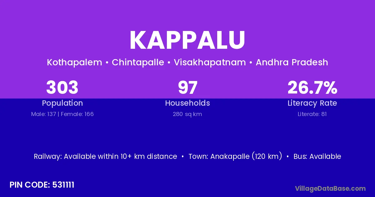 Anakapalle (120 km) is the nearest town to Kappalu village for major economic activities and is located approximately 120 km away.