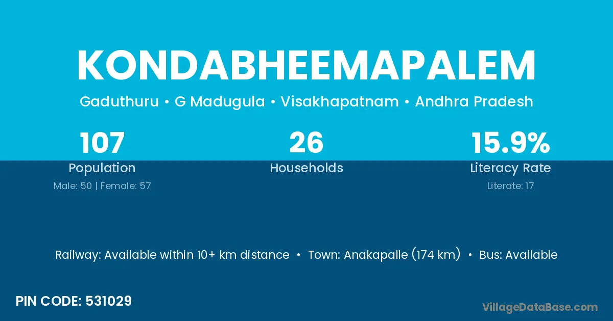 Kondabheemapalem village has a total population of 107 people, of which 50 are males and 57 are females.