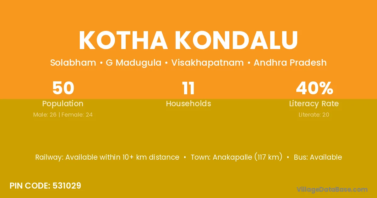Kotha Kondalu village has a total population of 50 people, of which 26 are males and 24 are females.