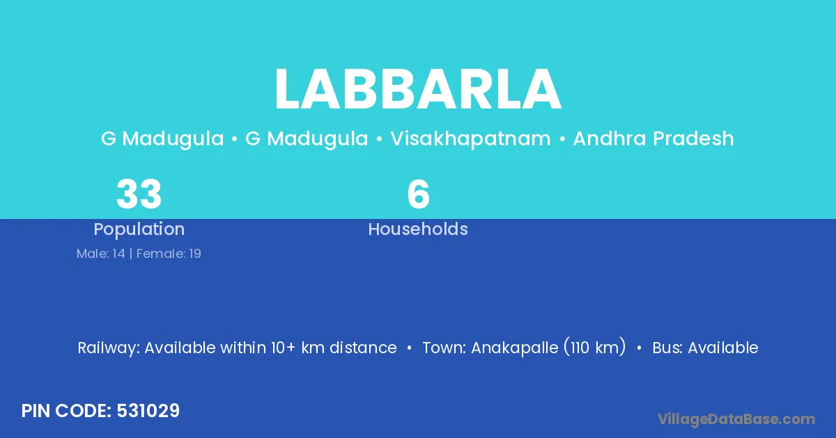 Anakapalle (110 km) is the nearest town to Labbarla village for major economic activities and is located approximately 110 km away.