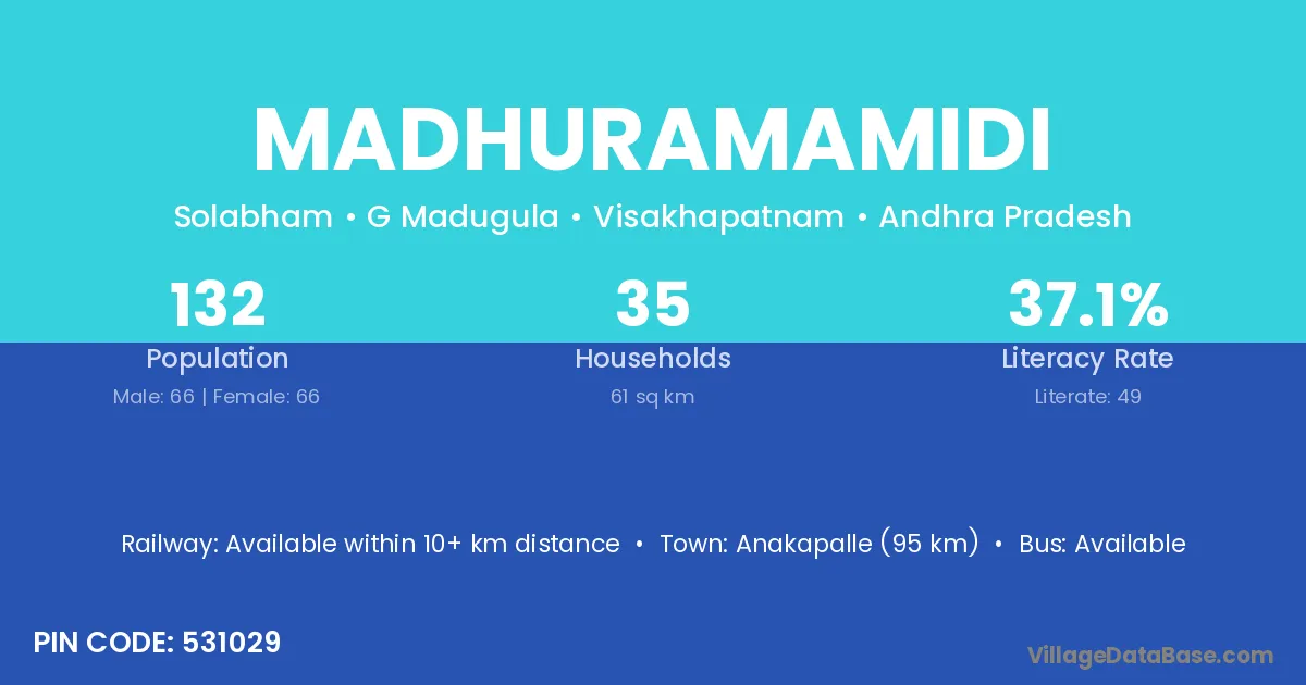 Madhuramamidi village has a total population of 132 people, of which 66 are males and 66 are females.