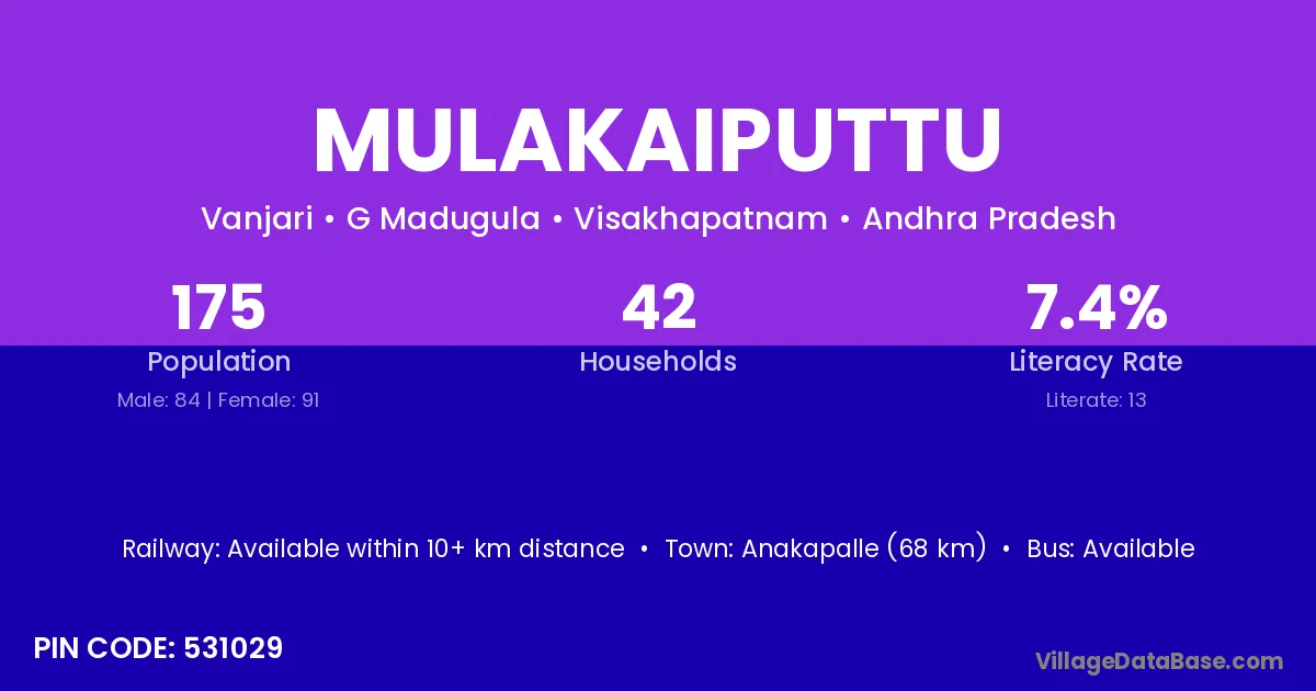 Anakapalle (68 km) is the nearest town to Mulakaiputtu village for major economic activities and is located approximately 68 km away.