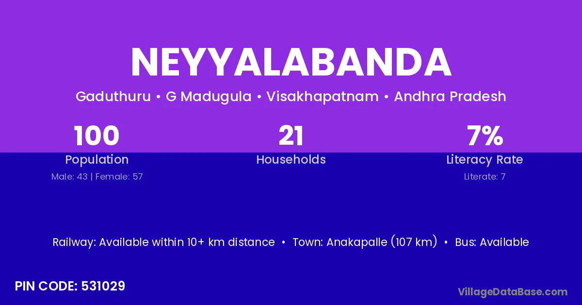 Anakapalle (107 km) is the nearest town to Neyyalabanda village for major economic activities and is located approximately 107 km away.