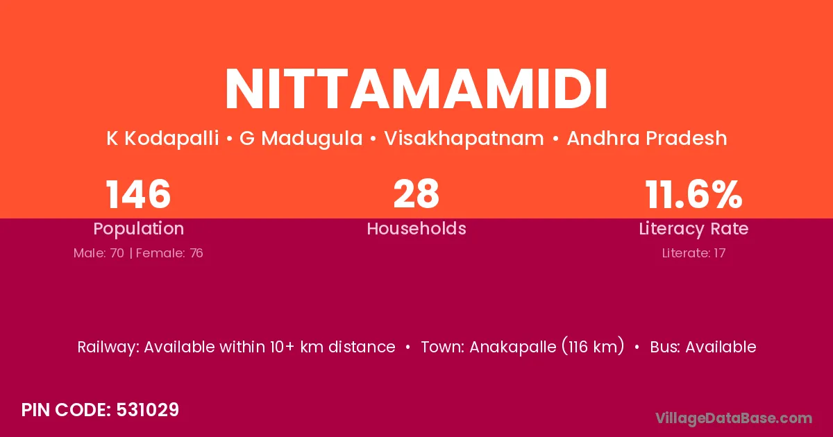 Anakapalle (116 km) is the nearest town to Nittamamidi village for major economic activities and is located approximately 116 km away.
