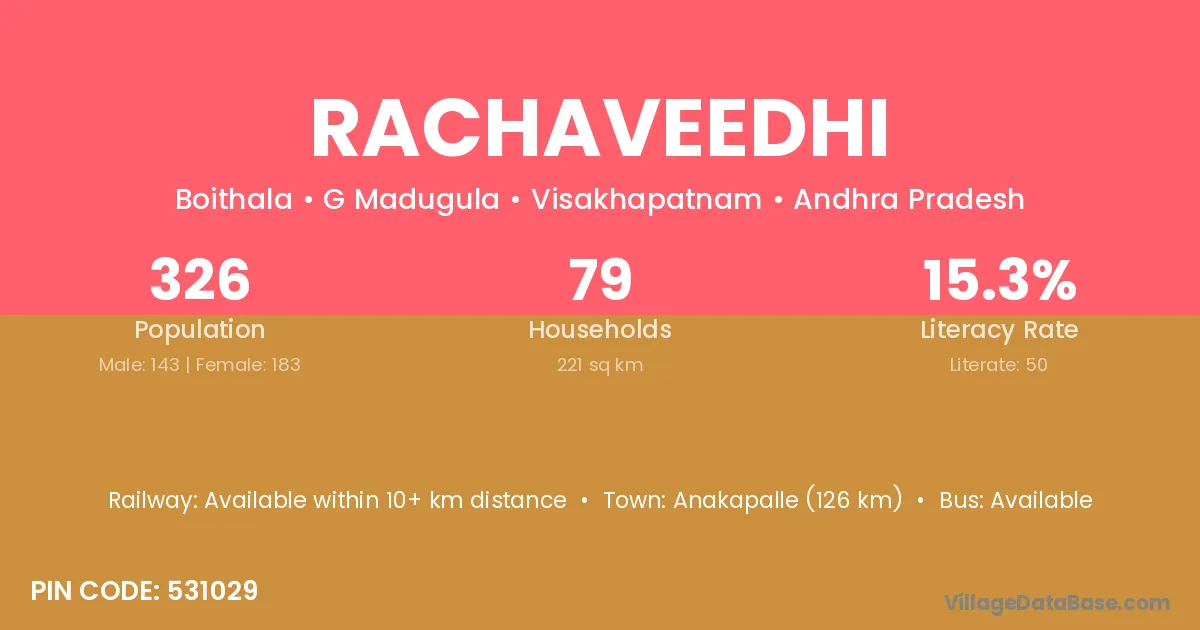 Rachaveedhi village has a total population of 326 people, of which 143 are males and 183 are females.