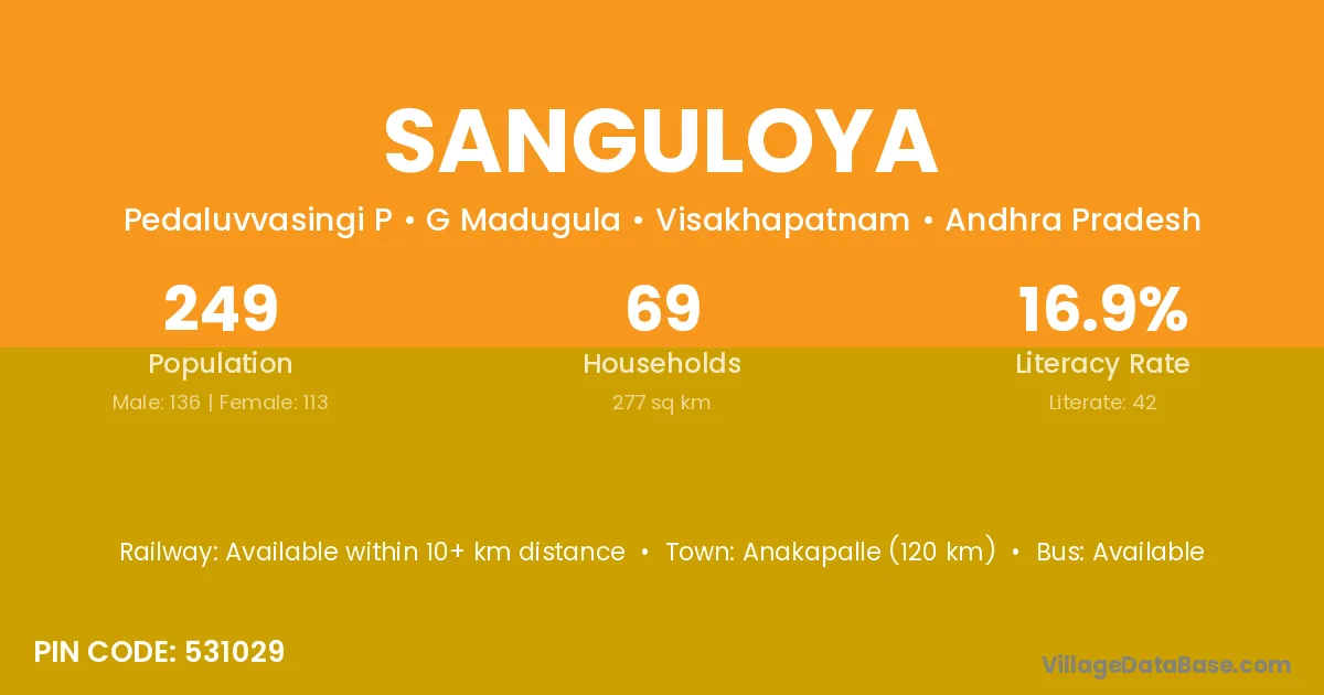Anakapalle (120 km) is the nearest town to Sanguloya village for major economic activities and is located approximately 120 km away.
