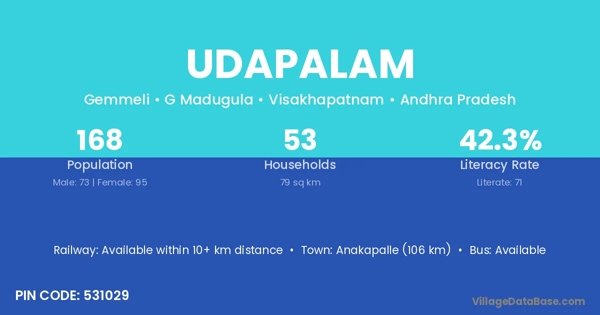Anakapalle (106 km) is the nearest town to Udapalam village for major economic activities and is located approximately 106 km away.