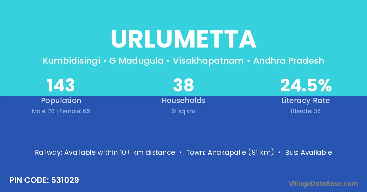 Anakapalle (91 km) is the nearest town to Urlumetta village for major economic activities and is located approximately 91 km away.