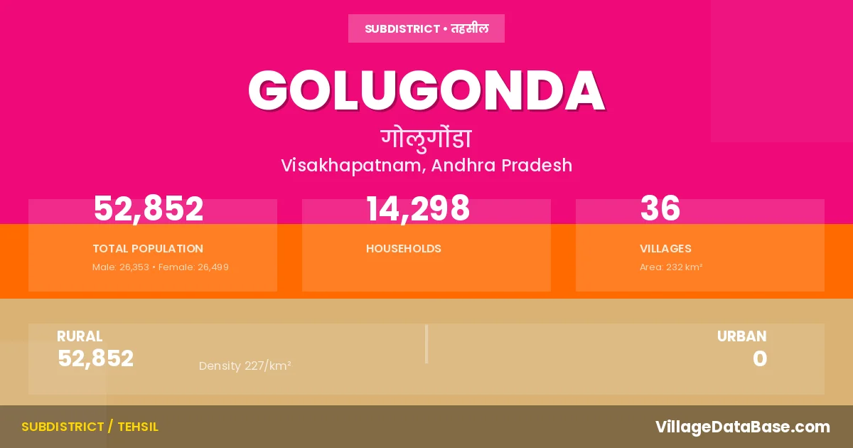 According to the 2011 census The total area of Golugonda Mandal is 232 km², with a population of 52852 people. The population density is 227 inhabitants per square kilometre, and there are approximately 14298 houses in the sub district.