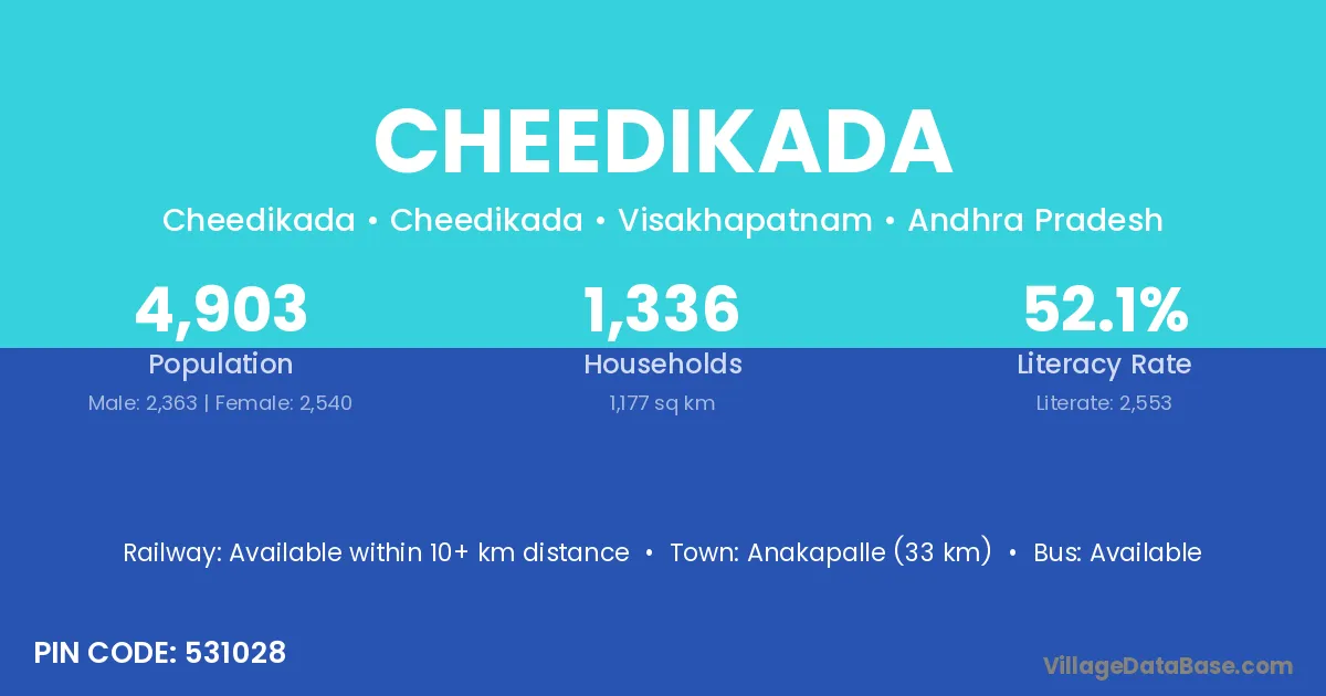 According to Census 2011 information, the village code of Cheedikada village is 531084.