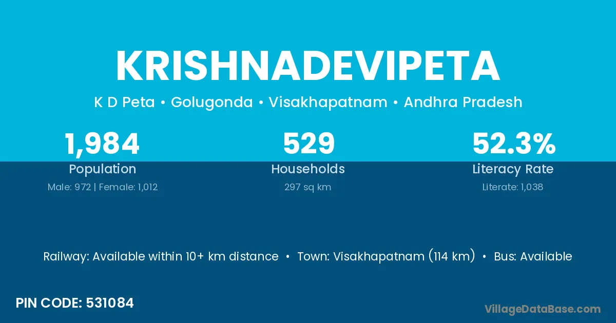 Krishnadevipeta village has a total population of 1,984 people, of which 972 are males and 1,012 are females.