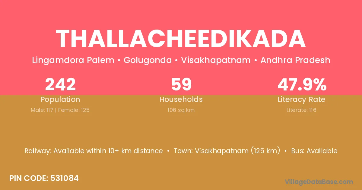 Thallacheedikada village has a total population of 242 people, of which 117 are males and 125 are females.