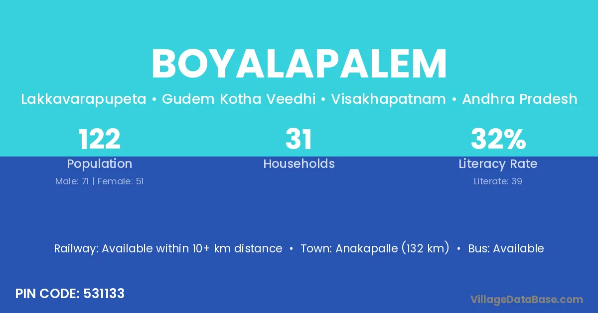 Boyalapalem village has a total population of 122 people, of which 71 are males and 51 are females.