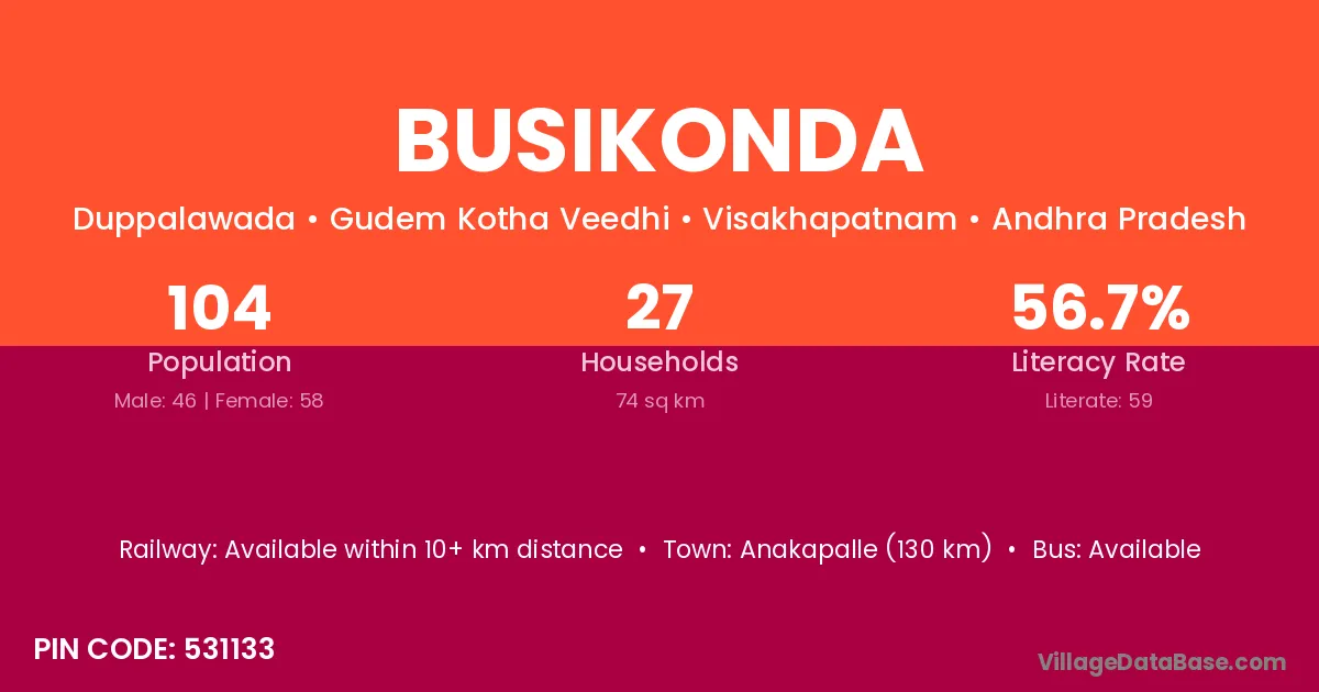 Busikonda village has a total population of 104 people, of which 46 are males and 58 are females.