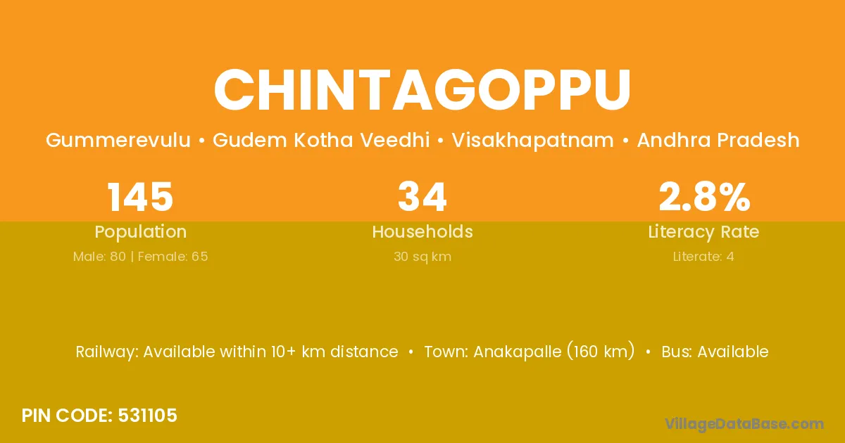 The literacy rate of Chintagoppu village is 2.76%. Male literacy stands at 5.00% and female literacy at 0.00%.