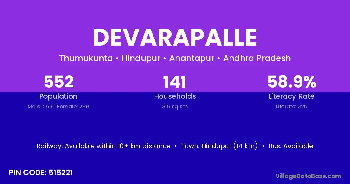 Devarapalle village has a total population of 895 people, of which 506 are males and 389 are females.