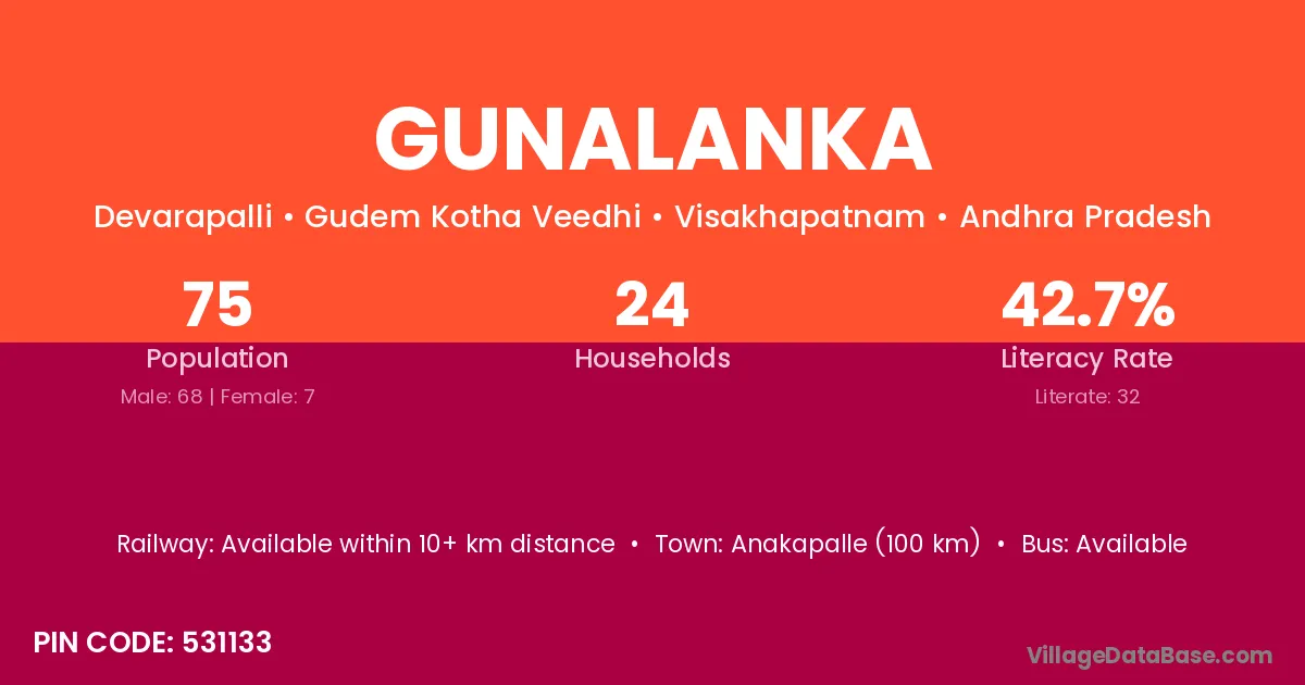 Gunalanka village has a total population of 75 people, of which 68 are males and 7 are females.