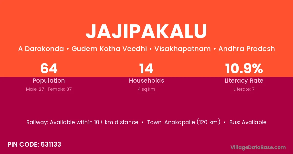 Jajipakalu village has a total population of 64 people, of which 27 are males and 37 are females.
