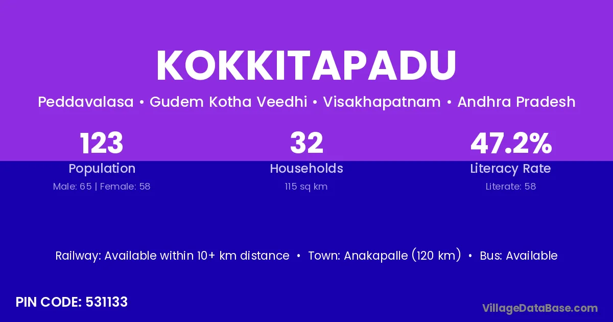 Anakapalle (120 km) is the nearest town to Kokkitapadu village for major economic activities and is located approximately 120 km away.