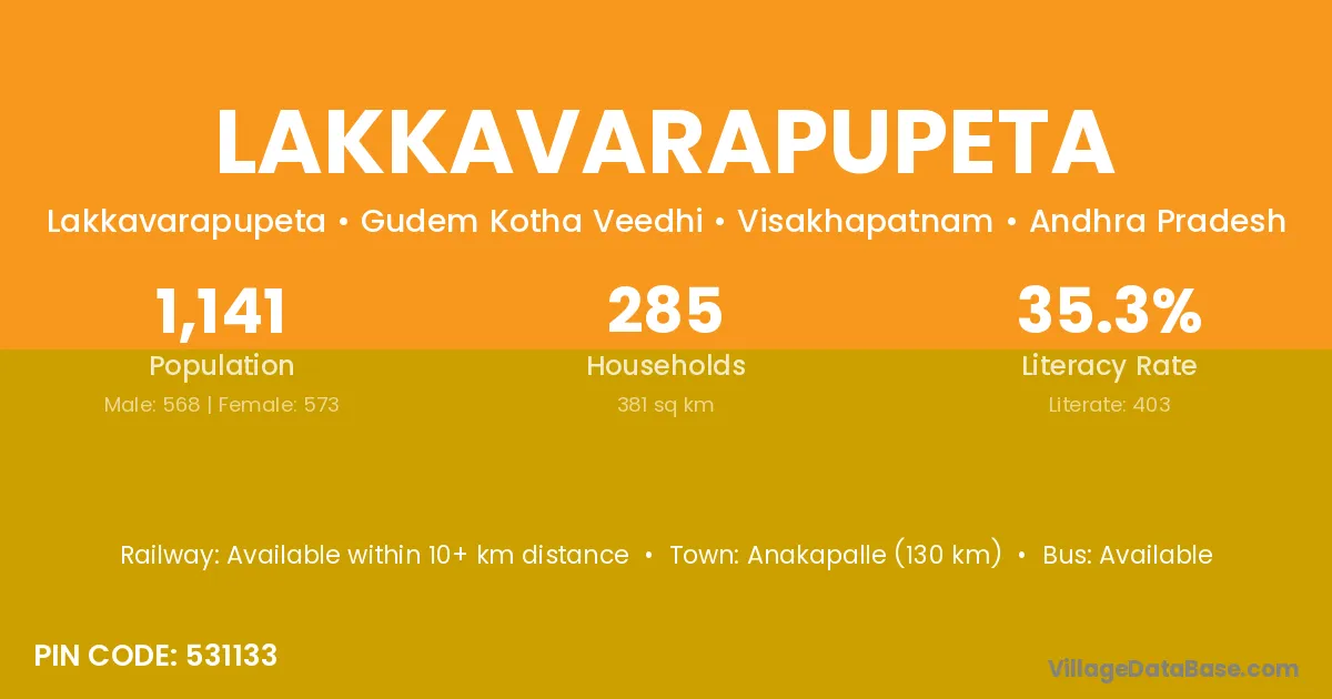 Lakkavarapupeta village has a total population of 1,141 people, of which 568 are males and 573 are females.