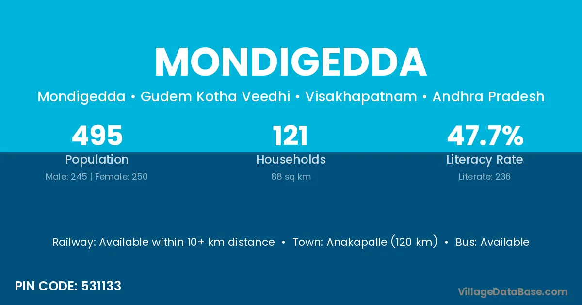 Anakapalle (120 km) is the nearest town to Mondigedda village for major economic activities and is located approximately 120 km away.