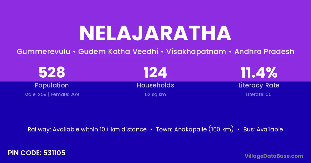 Anakapalle (160 km) is the nearest town to Nelajaratha village for major economic activities and is located approximately 160 km away.