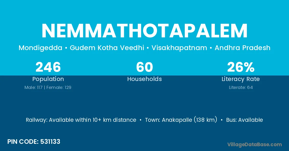 According to Census 2011 information, the village code of Nemmathotapalem village is 531133.