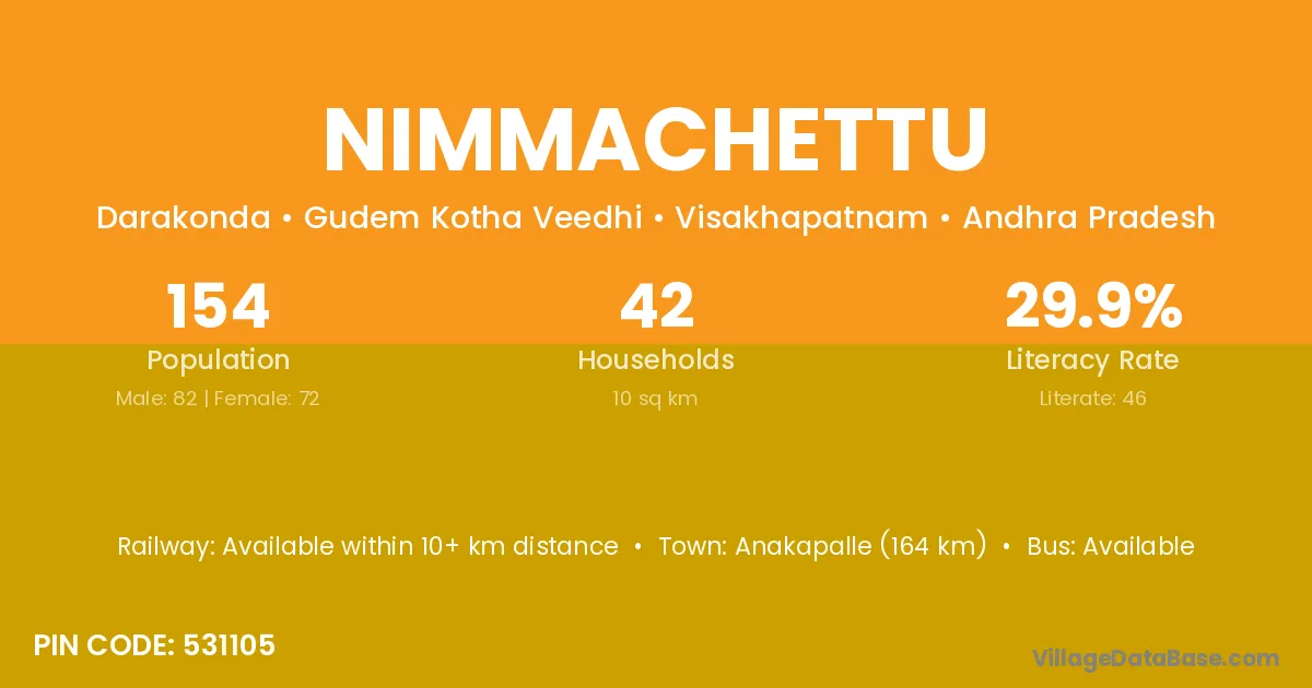 Anakapalle (164 km) is the nearest town to Nimmachettu village for major economic activities and is located approximately 164 km away.