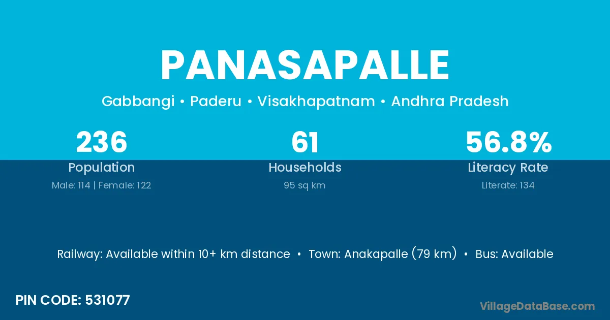 Anakapalle (122 km) is the nearest town to Panasapalle village for major economic activities and is located approximately 122 km away.