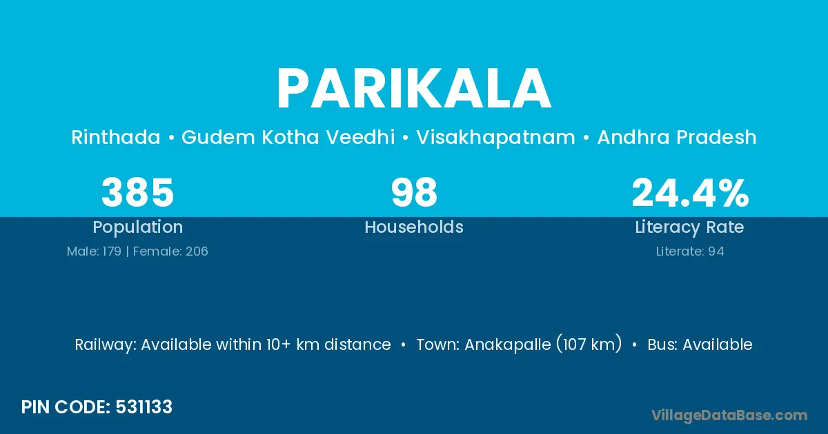 Anakapalle (107 km) is the nearest town to Parikala village for major economic activities and is located approximately 107 km away.