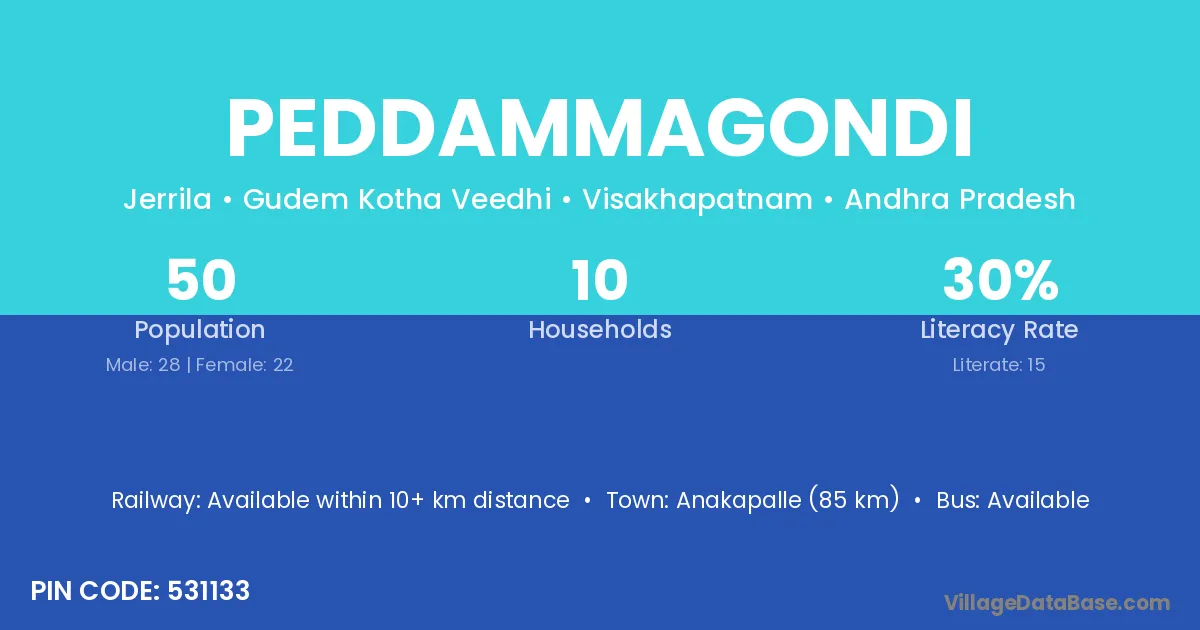 Anakapalle (85 km) is the nearest town to Peddammagondi village for major economic activities and is located approximately 85 km away.
