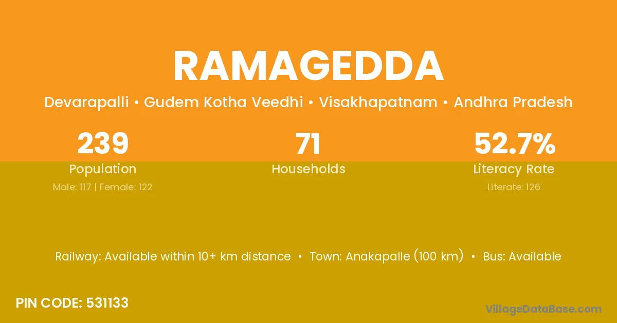 Ramagedda village has a total population of 239 people, of which 117 are males and 122 are females.