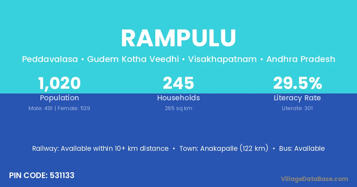 Anakapalle (122 km) is the nearest town to Rampulu village for major economic activities and is located approximately 122 km away.
