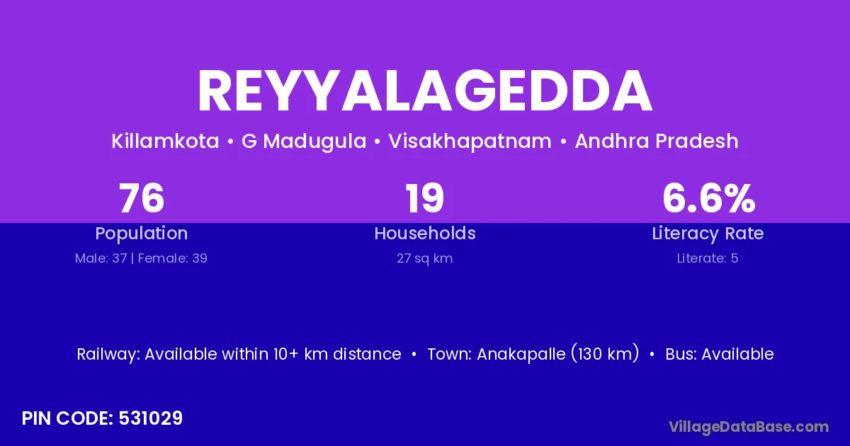 Anakapalle (120 km) is the nearest town to Reyyalagedda village for major economic activities and is located approximately 120 km away.
