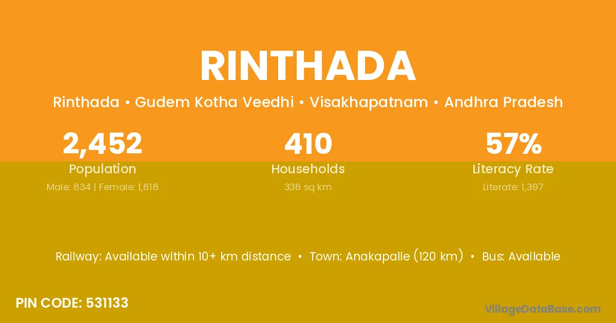 Anakapalle (120 km) is the nearest town to Rinthada village for major economic activities and is located approximately 120 km away.