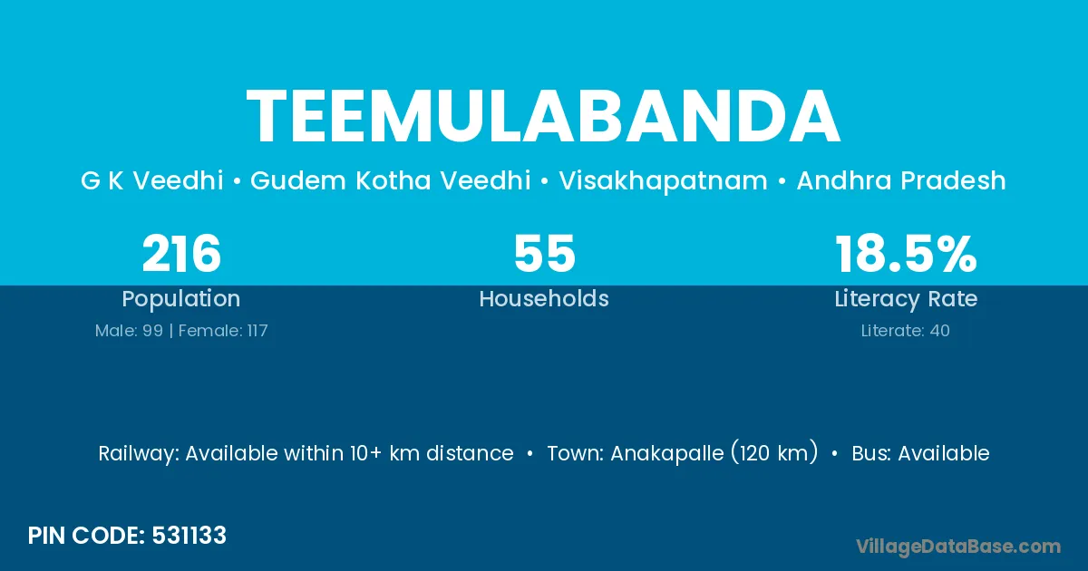 Teemulabanda village has a total population of 216 people, of which 99 are males and 117 are females.