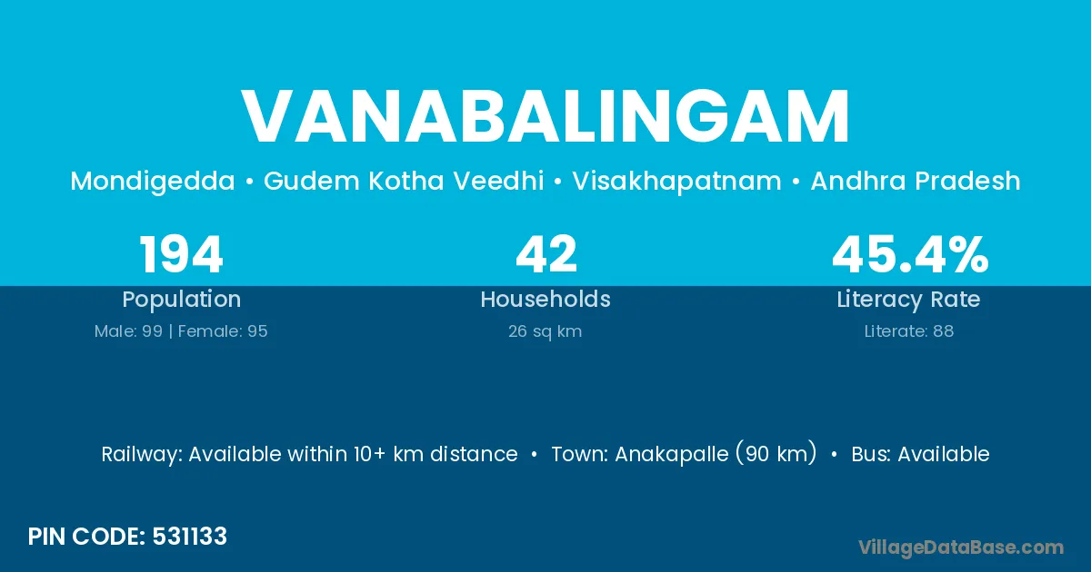 Anakapalle (90 km) is the nearest town to Vanabalingam village for major economic activities and is located approximately 90 km away.