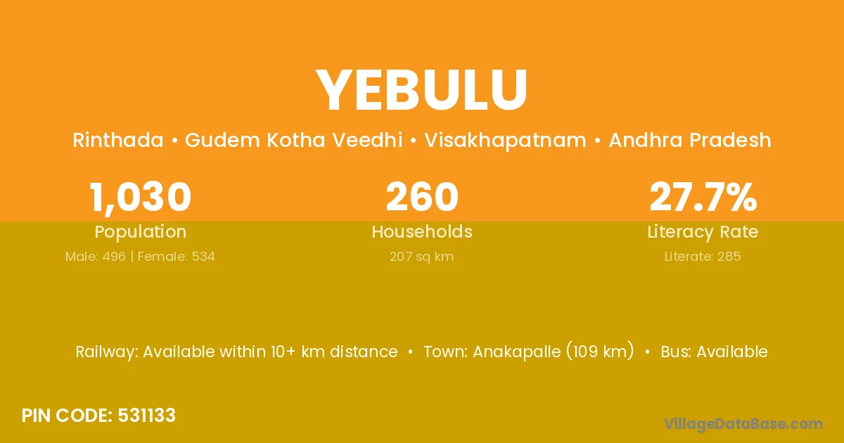 Anakapalle (109 km) is the nearest town to Yebulu village for major economic activities and is located approximately 109 km away.