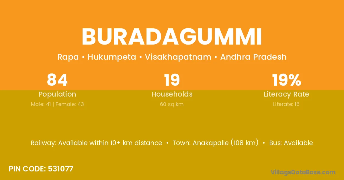 Anakapalle (108 km) is the nearest town to Buradagummi village for major economic activities and is located approximately 108 km away.