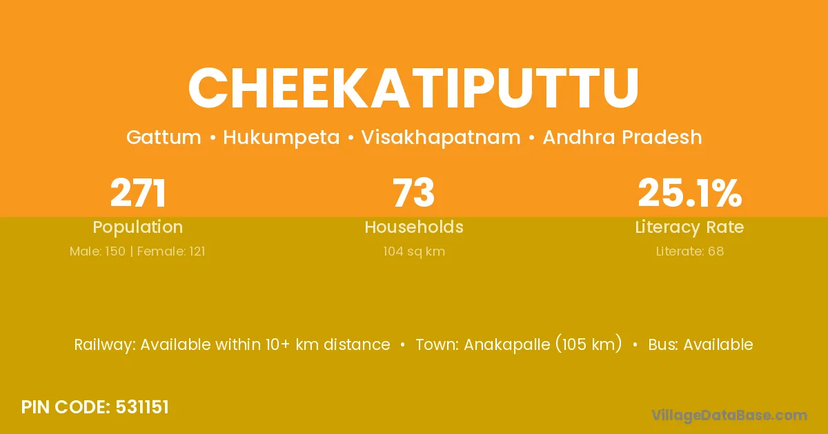 Anakapalle (105 km) is the nearest town to Cheekatiputtu village for major economic activities and is located approximately 105 km away.