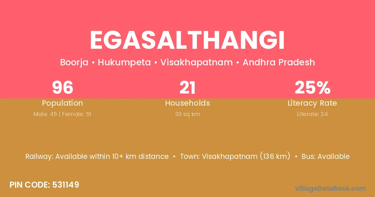 Egasalthangi village has a total population of 96 people, of which 45 are males and 51 are females.